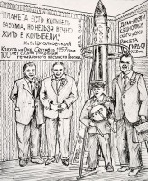 Ученик Некрасовской школы Александр Папков и великие советские ракетчики в Доме музее Циолковского в 1957 году. Рисовал Бучарский В.В.