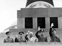 Председатель советского народа Н. С. Хрущёв и первые космические военлёты на Красной площади в Москве. Август 1962 года